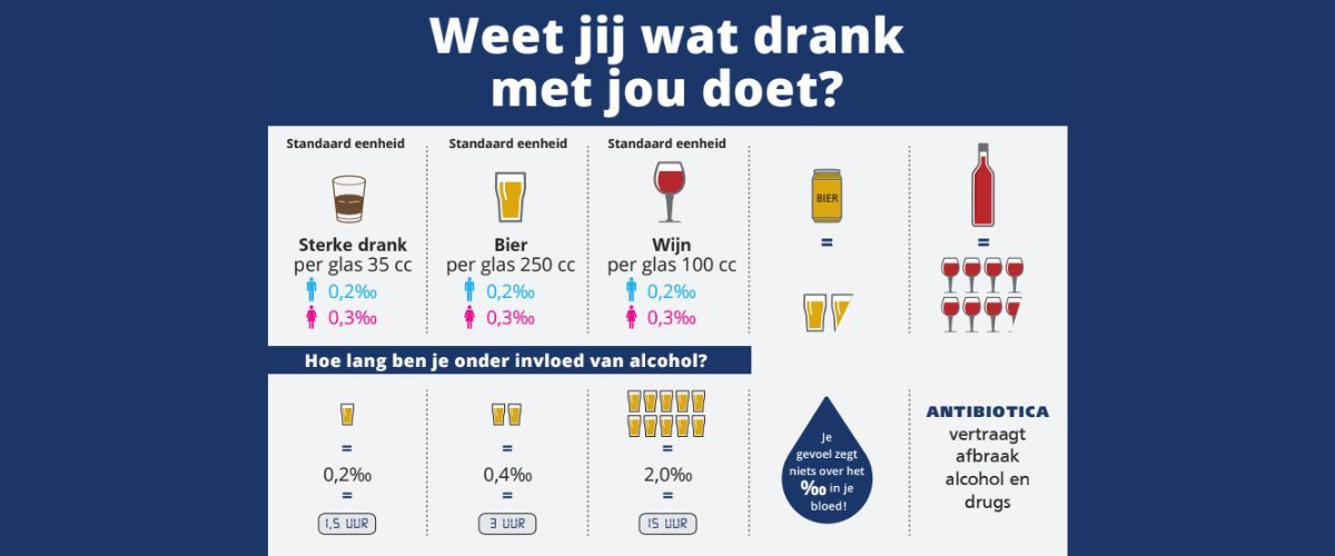 Wanneer ben je weer nuchter na een avondje doorzakken? Hoe lang blijf je onder invloed van drugs? Mag je rijden als je kalmeringsmiddelen gebruikt? Het antwoord op al die vragen staat op onze handige poster. Downloaden, printen en ophangen op een duidelijke plek in je organisatie!